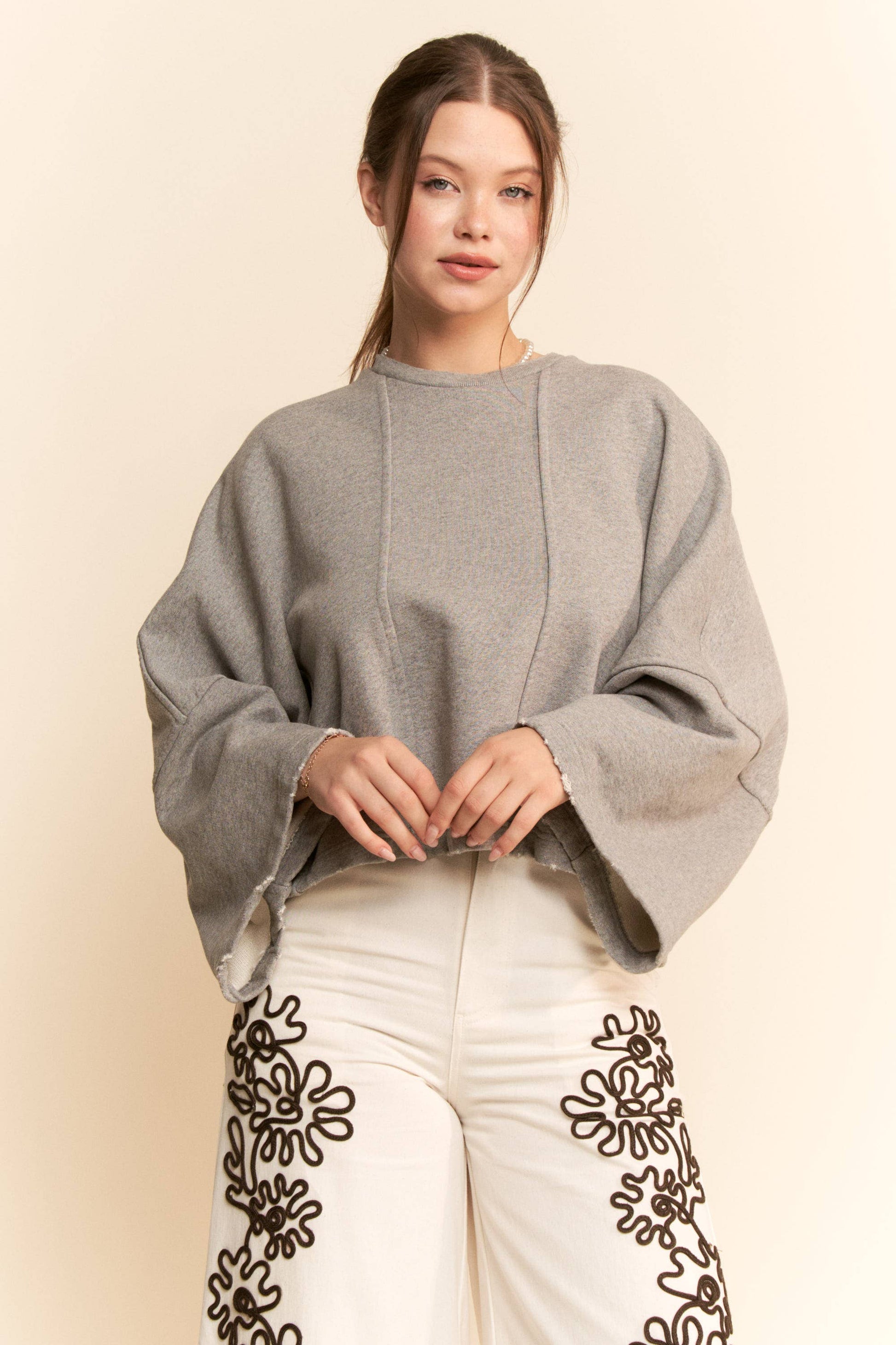 Meet your new favorite everyday layer. This heather gray sweatshirt features an ultra-comfortable oversized, boxy silhouette and unique wide sleeves with a slightly raw, distressed edge. The front-facing seam details add a modern, deconstructed touch. Pair it with high-waisted denim or the perfect pair of lounge pants for an effortlessly chic look.