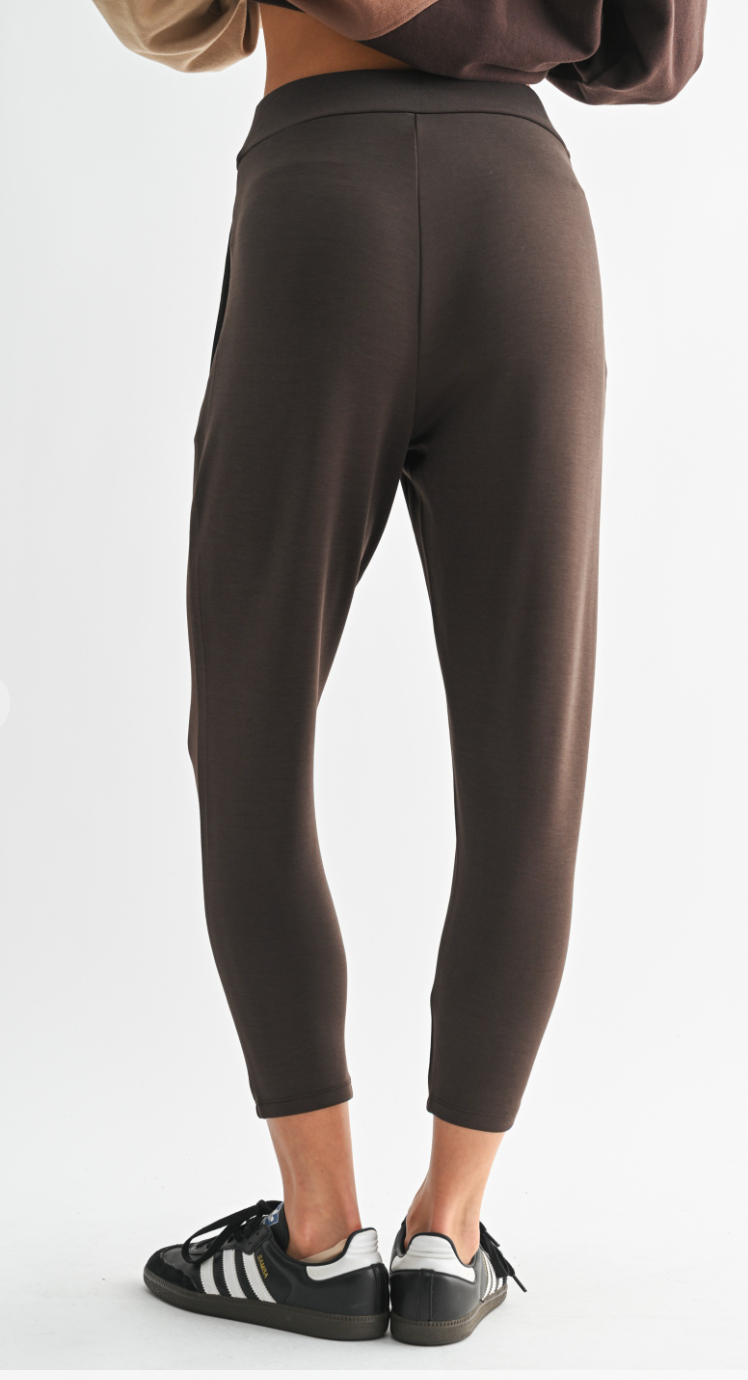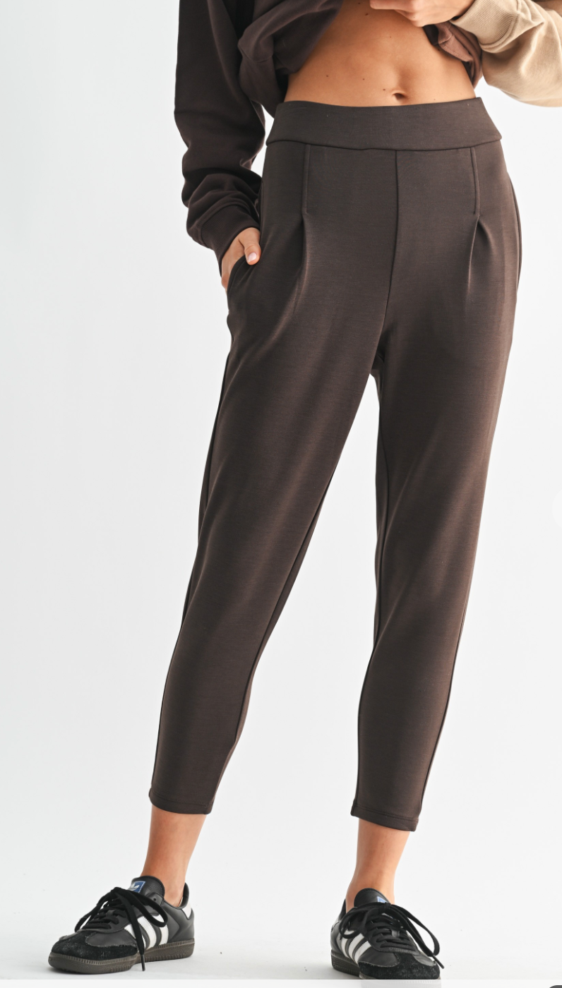 Upgrade your essentials with the Pleated Scuba 7/8 Tailored Pant. Made from buttery soft scuba fabric, these pants offer a sleek, elegant look while maintaining comfort for all-day wear. The side pockets add practical flair, and the elastic sewn into the waist seam ensures a flat, streamlined fit. Perfectly tailored for a flattering silhouette, these pants can easily be dressed up for a night out or dressed down for a casual day.