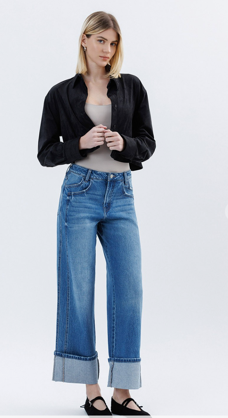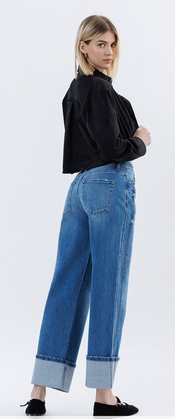 Elevate your casual wardrobe with our super high-rise cuffed baggy wide jeans, featuring a trendy high-waisted fit that elongates your silhouette. Crafted from premium denim, these jeans offer a relaxed yet stylish silhouette with their wide-leg design and comfy cuffed hems, perfect for creating effortless vintage-inspired looks. The distressed detailing adds a touch of edge, making them a versatile staple for both day and night outfits. Pair them with your favorite crop top or tucked-in blouse for a chic, laid-back vibe.
