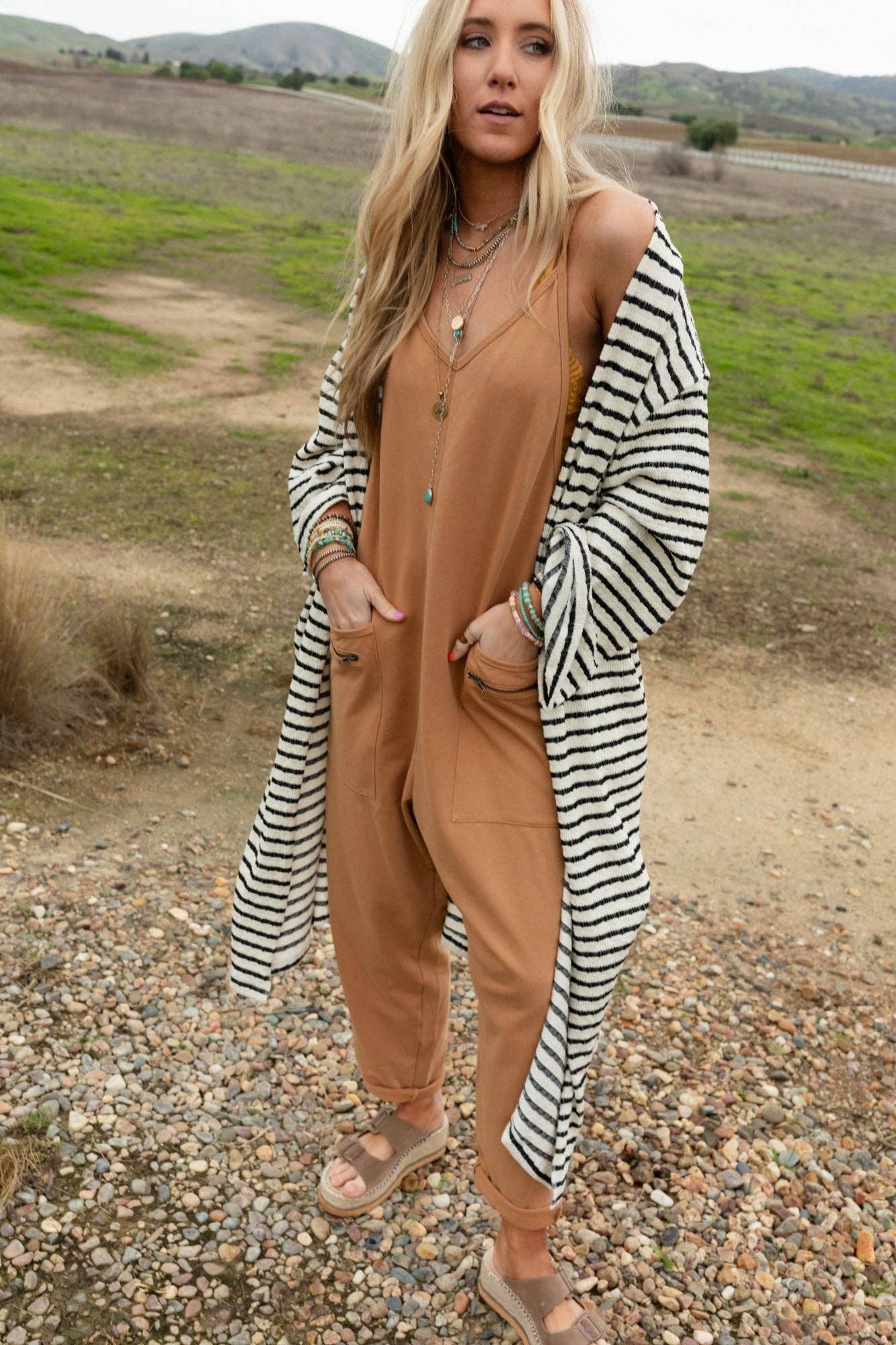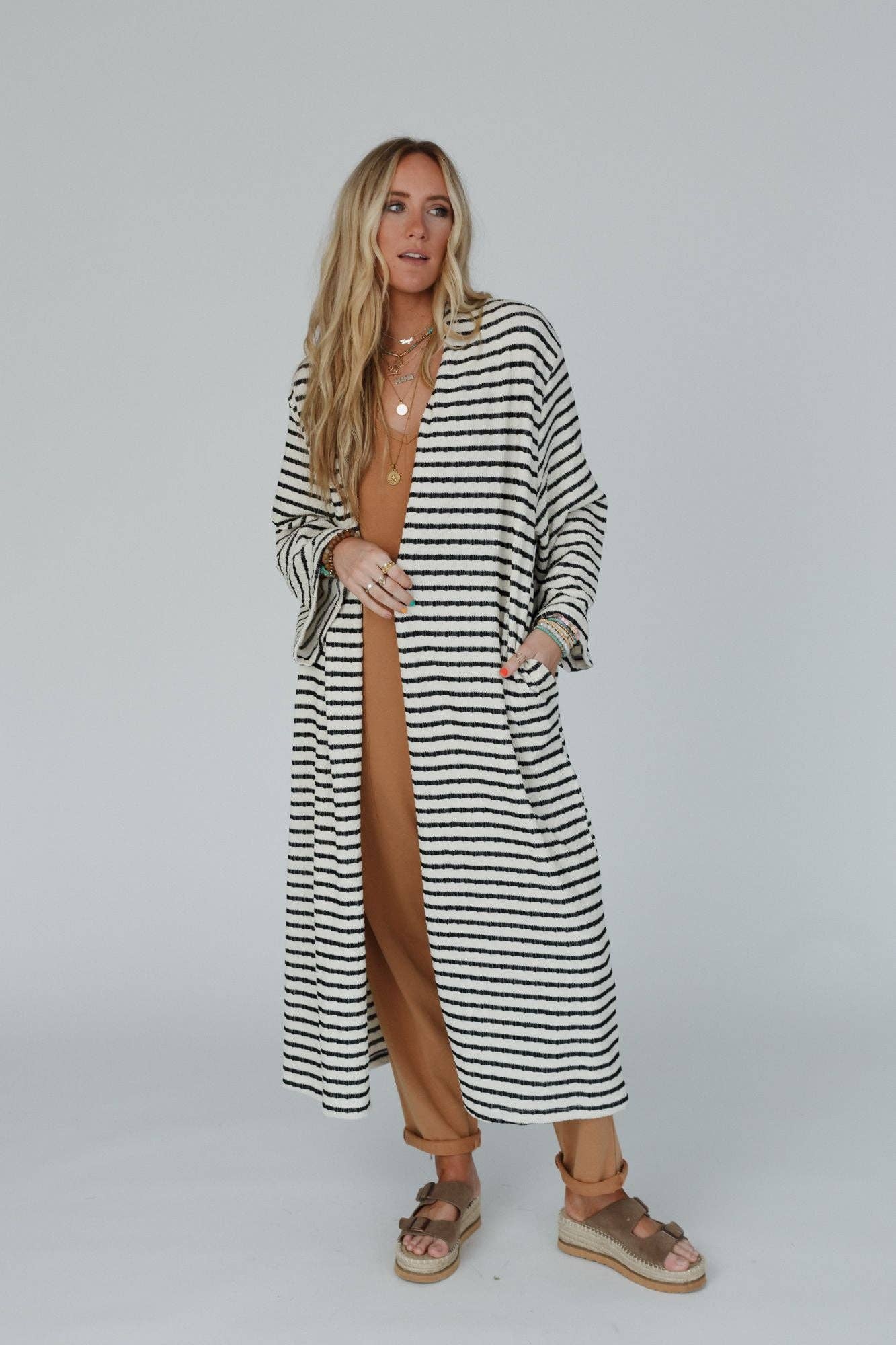 Effortlessly blending bohemian spirit with relaxed western charm, the Venyx Striped Duster Cardigan is a timeless piece that brings easy elegance to any wardrobe. With its flowing silhouette and earthy-toned stripes, this chic duster adds a touch of casual sophistication to any outfit. Whether you're layering it over a sundress in the warmer months or pairing it with jeans and boots in cooler weather, its versatility makes it a year-round staple.Â