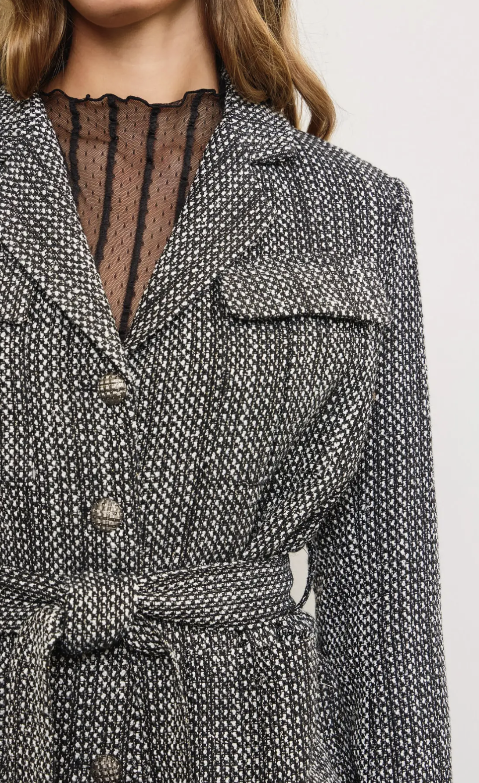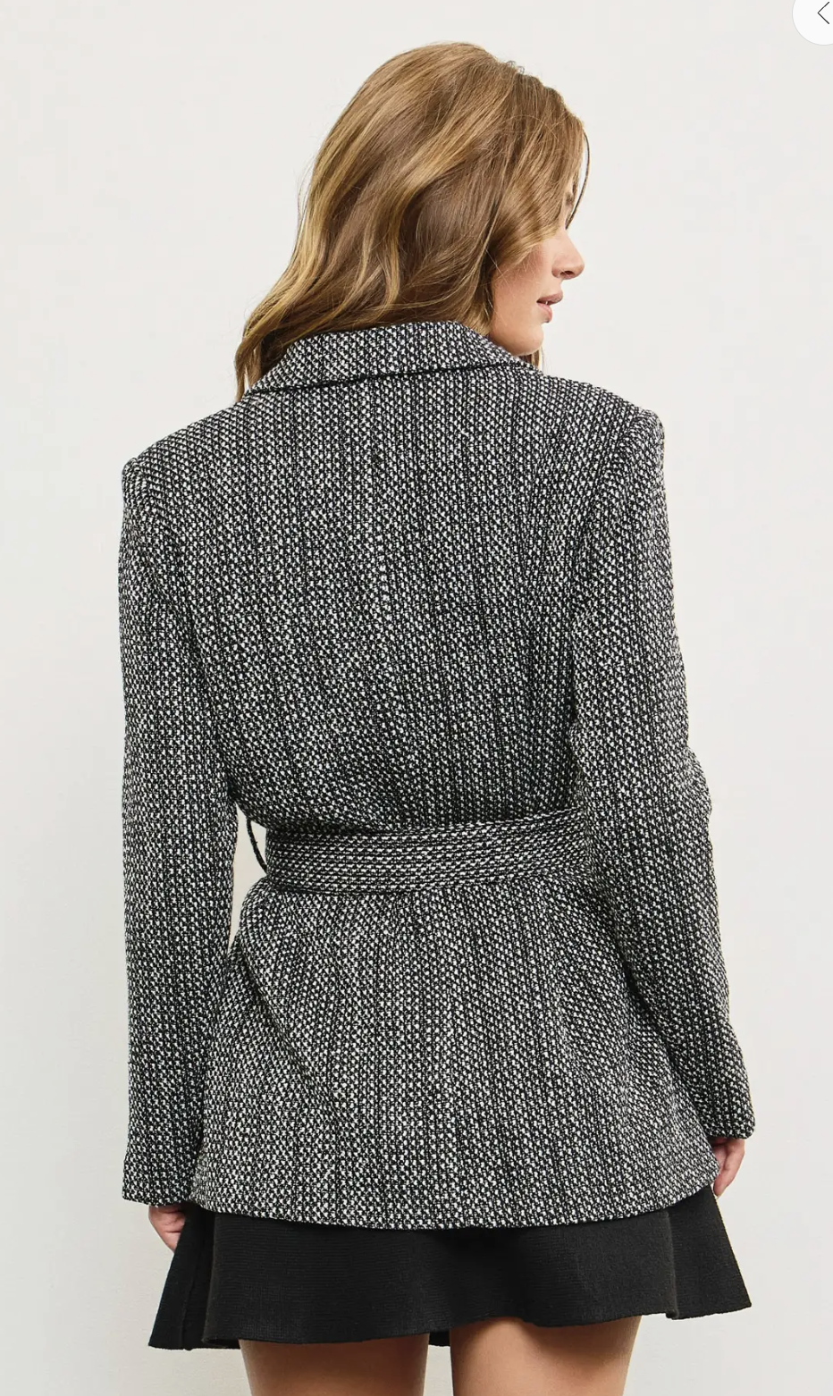 Elevate your look with this belted textured jacket, featuring a chic black-and-white weave, button-front closure, and flattering tie waist. Perfect for layering over blouses or dresses, it brings a polished yet modern edge to any outfit.